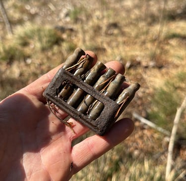 Un bel caricatore per fucile Carcano Mod. 1981! Vedete le ogive? No...perché non ci sono! E perché non ci sono? Perché i recuperanti un tempo asportavano la polvere e le palle dalle cartucce, per poter recuperare materiali da rivendere. Un bel segno di passaggio dei miei predecessori. Son felice di sapere che sto camminando sui loro stessi passi. Non è un ritrovamento assurdo, neanche troppo raro, ma da quel guizzo in più ad una giornata appena iniziata.