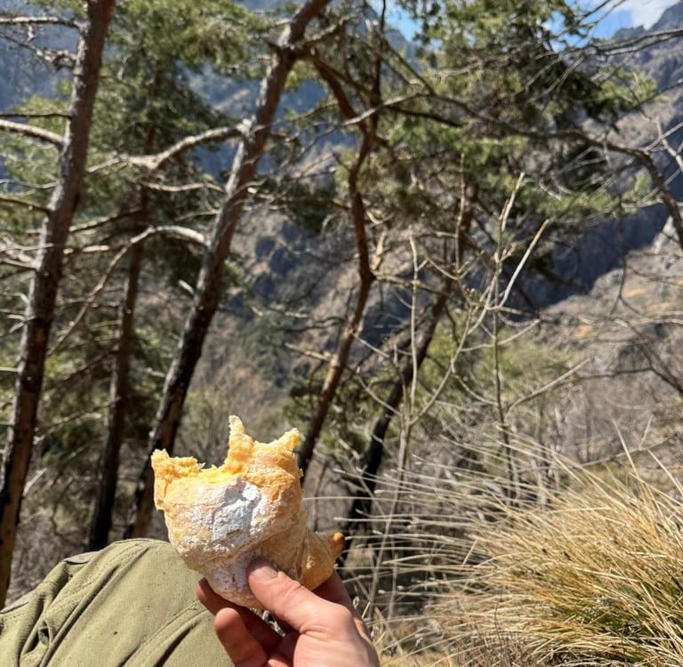 La giornata sta giungendo al termine. Ho un corso fra poche ore e devo rientrare. Trovo una pietra panoramica, mi siedo e recupero l'involto che ho cacciato nella retina dello zaino. Brioche alla crema. Spettacolo. Canto a bassa voce.